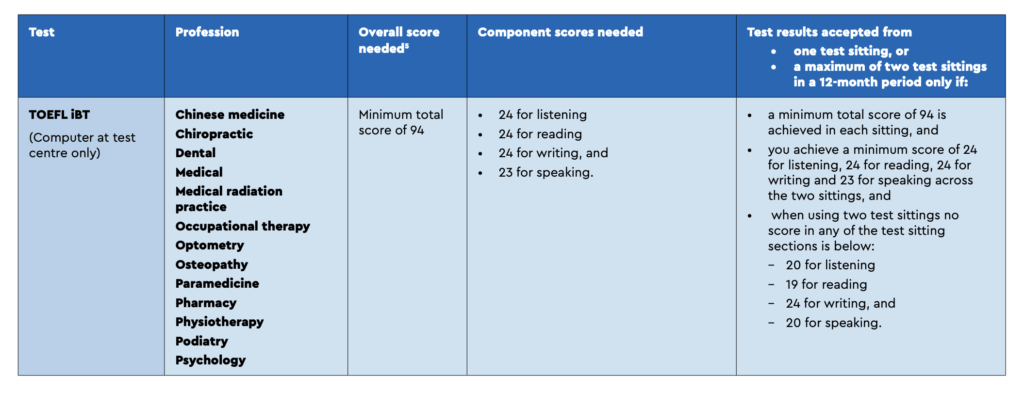これは、オーストラリアで薬剤師として AHPRA に登録されるための英語試験の概要になります。オーストラリアでは、AHPRA が認めている 5つの英語試験の中から、いずれかを選択することができます。条件を満たせば、2つの試験結果を合算して提出することも可能です。
